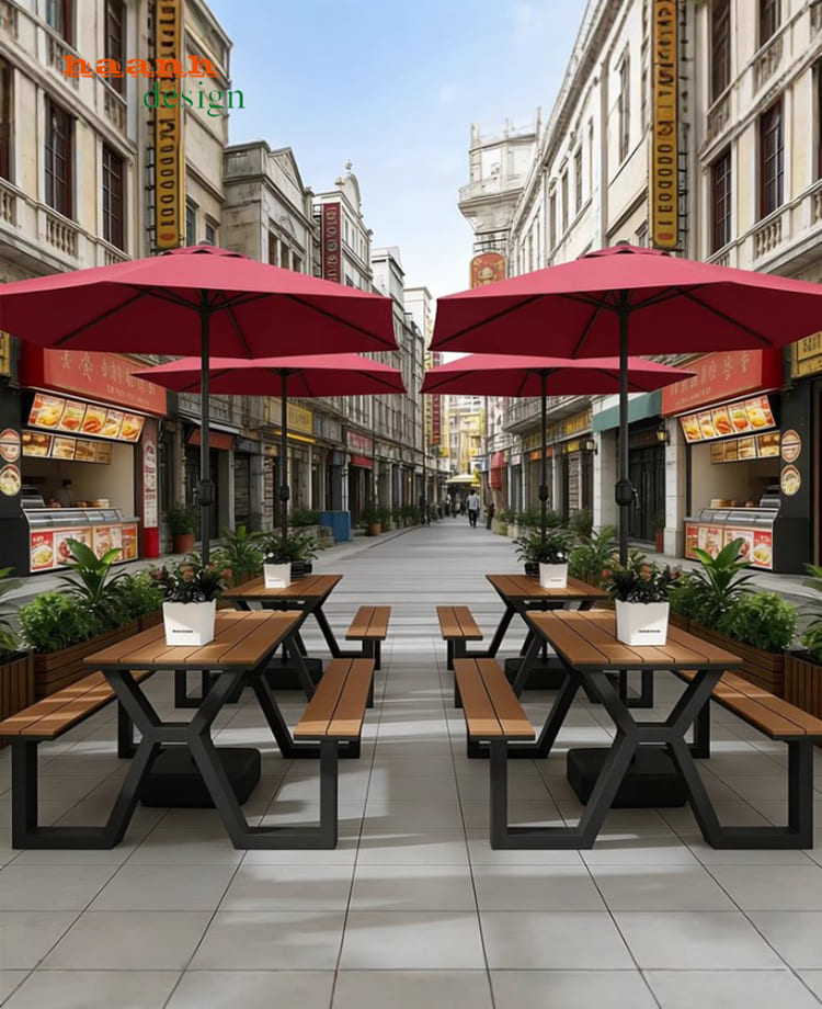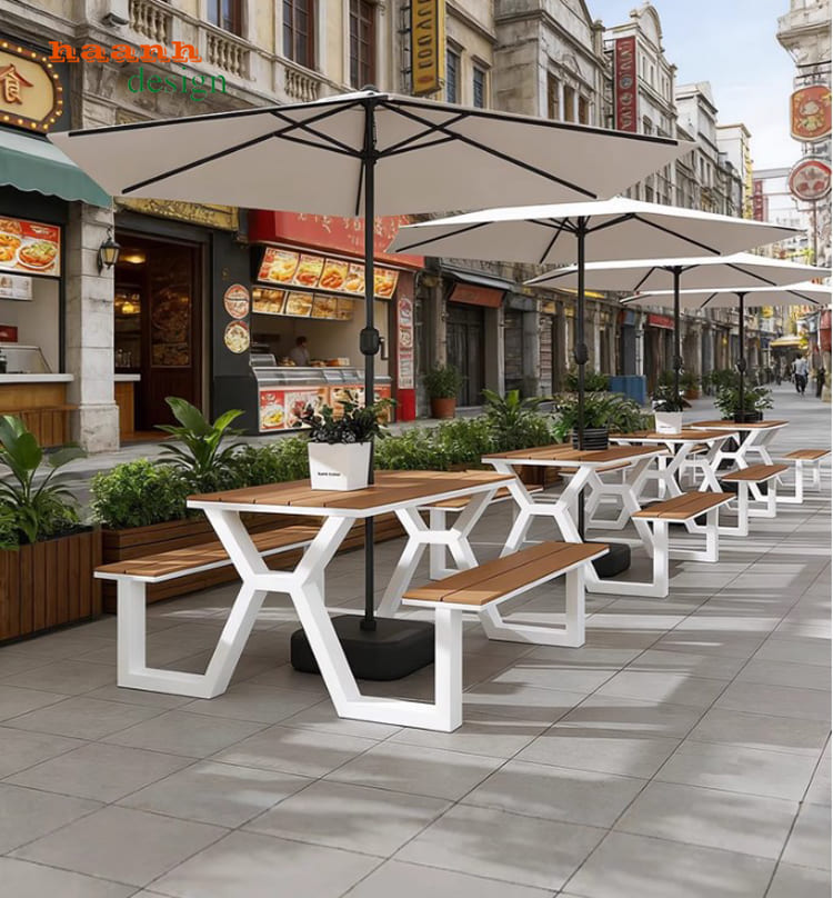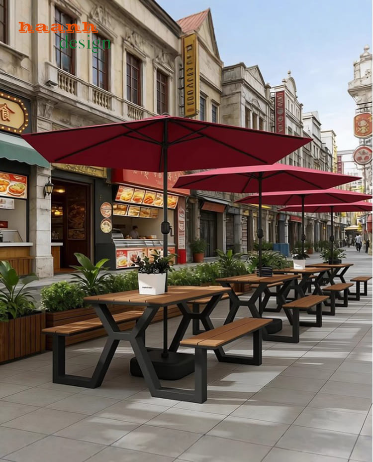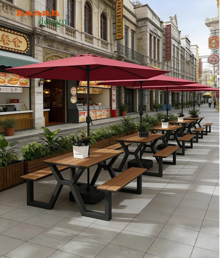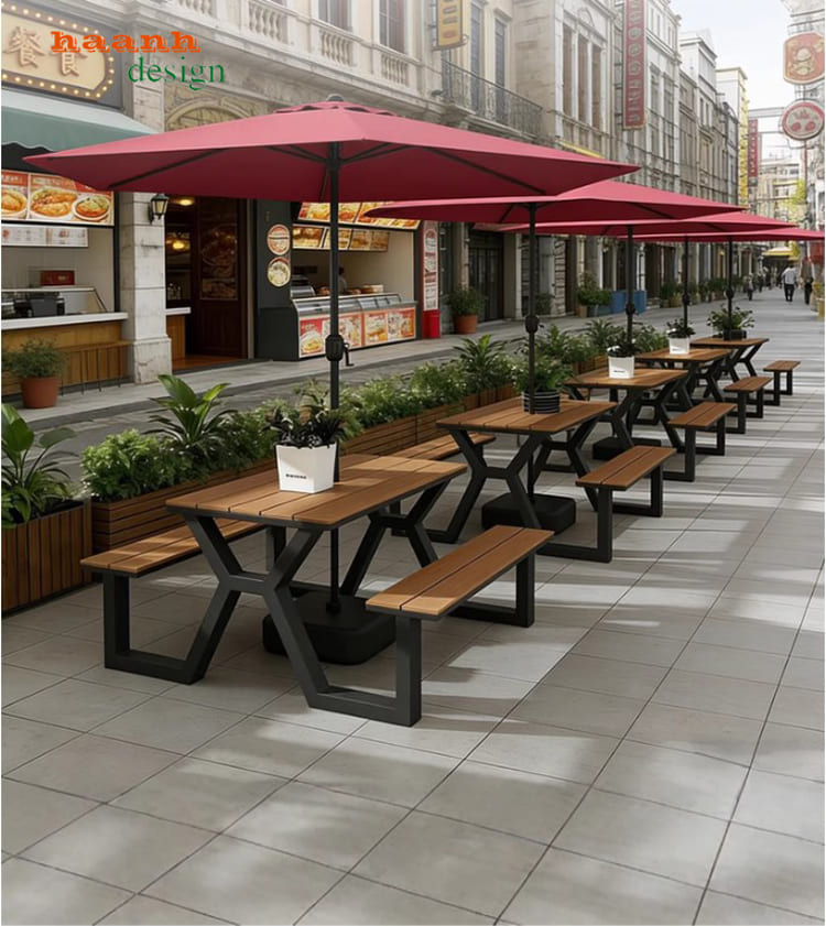 Khi kết hợp với khung sắt sơn tĩnh điện, bàn ghế chân sắt mặt gỗ trở thành sản phẩm có độ bền và tính thẩm mỹ cao, phù hợp cho mọi công trình ngoài trời.