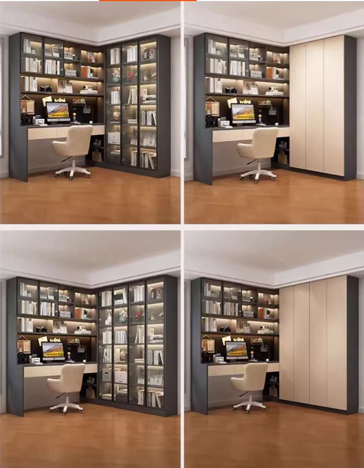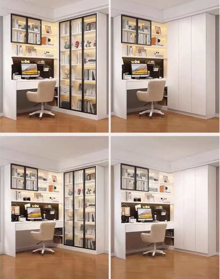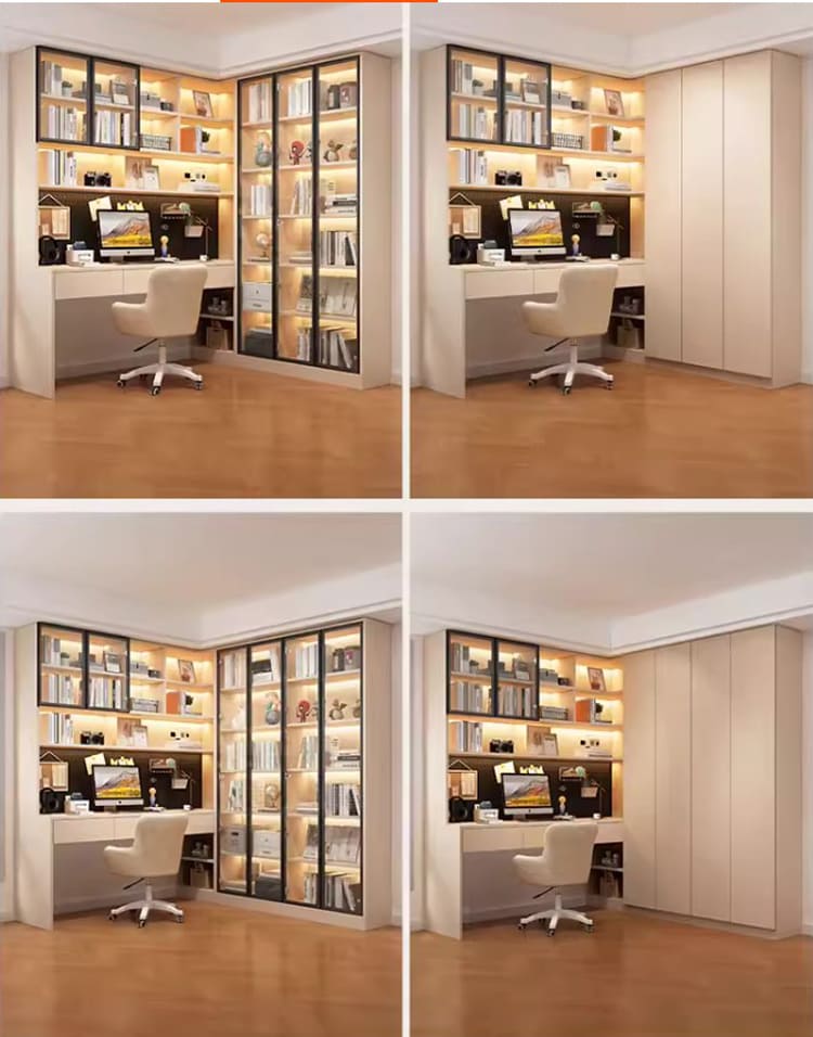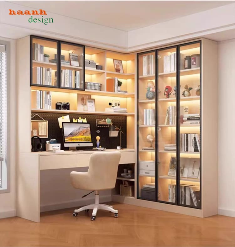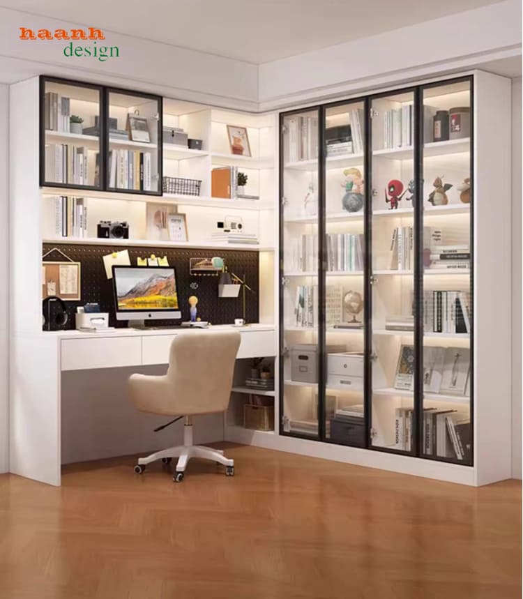 Thiết kế bàn làm việc tích hợp tủ sách cánh kính sang trọng và tiện lợi.