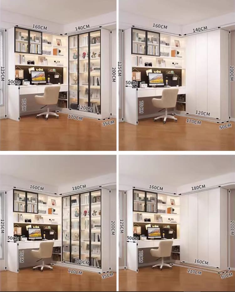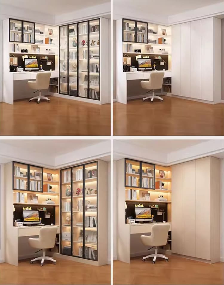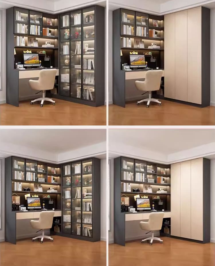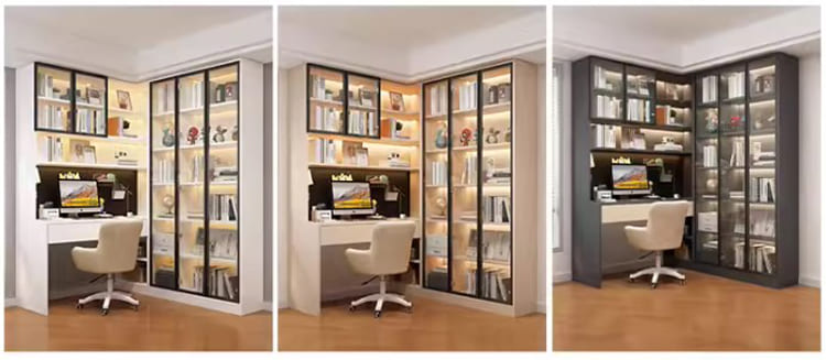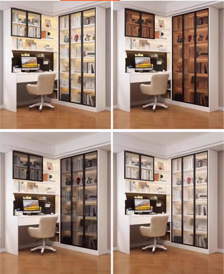 Thiết kế bàn làm việc tích hợp tủ sách cánh kính sang trọng và tiện lợi.