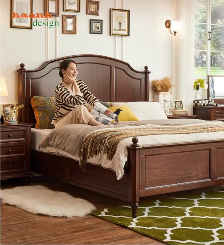 Điểm làm nên sự khác biệt của giường tân cổ điển kiểu Mỹ chính là chất liệu gỗ óc chó (Walnut) tự nhiên nhập khẩu Bắc Mỹ.