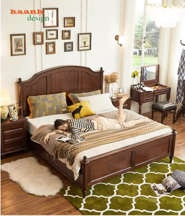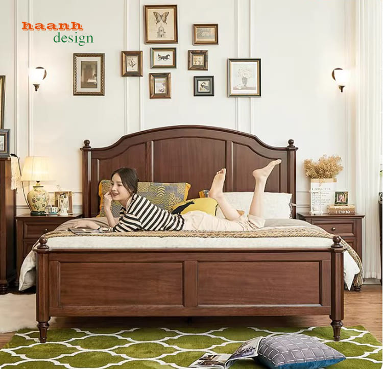 Giường tân cổ điển kiểu Mỹ được chế tác từ gỗ óc chó tự nhiên nhập khẩu Bắc Mỹ, hoàn thiện sơn PU Inchem Mỹ và phụ kiện Hafele Đức cao cấp. Thiết kế sang trọng, chuẩn phong cách Mỹ, phù hợp không gian phòng ngủ gia đình. Sản phẩm không chỉ bền đẹp theo thời gian mà còn thể hiện đẳng cấp và gu thẩm mỹ tinh tế của gia chủ.