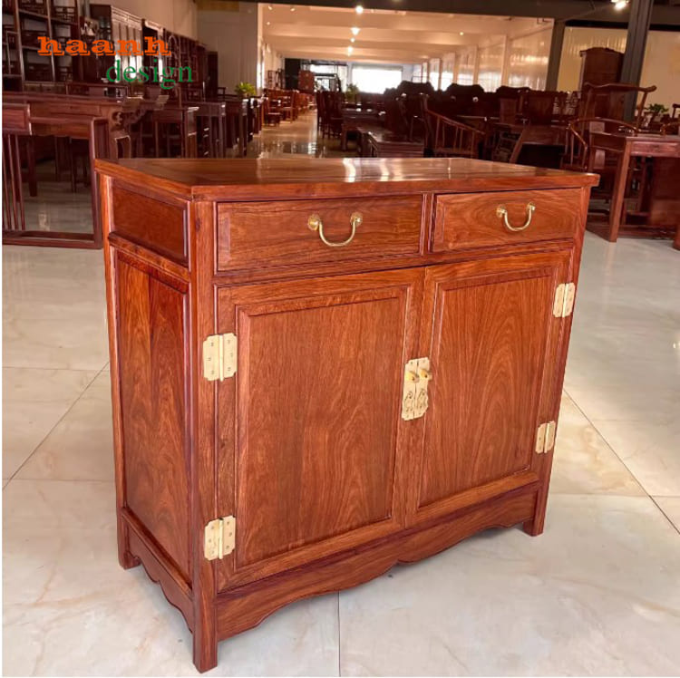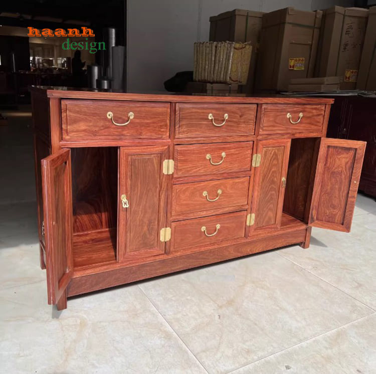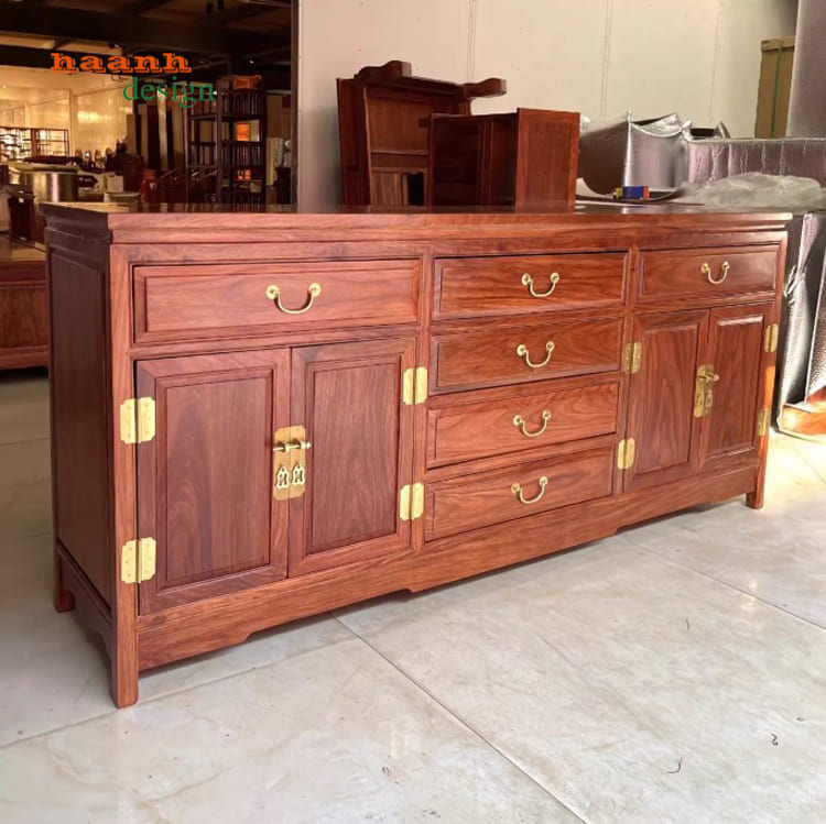Sự kết hợp giữa gỗ hương và phụ kiện cao cấp giúp kệ tivi gỗ giả cổ vừa đẹp vừa tiện dụng.