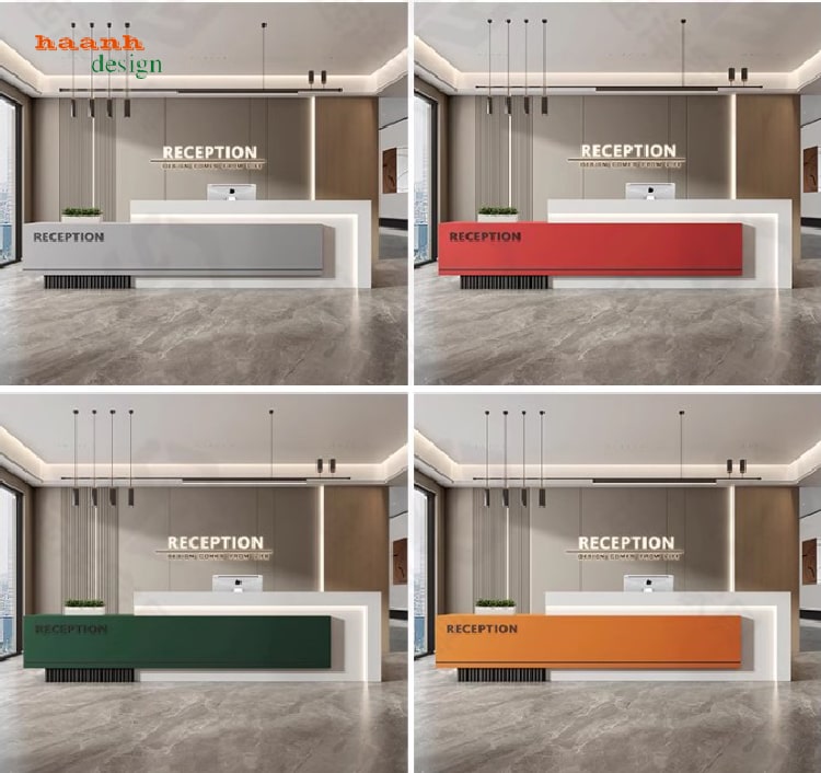 Các quầy lễ tân văn phòng được thiết kế linh hoạt: chữ L, chữ U, dáng cong mềm mại hoặc tối giản thẳng góc. Doanh nghiệp có thể lựa chọn kiểu dáng phù hợp với diện tích và phong cách nội thất.