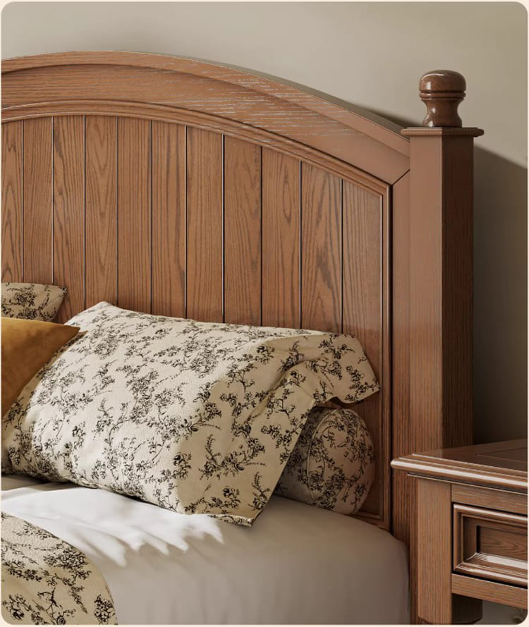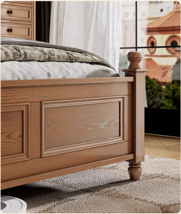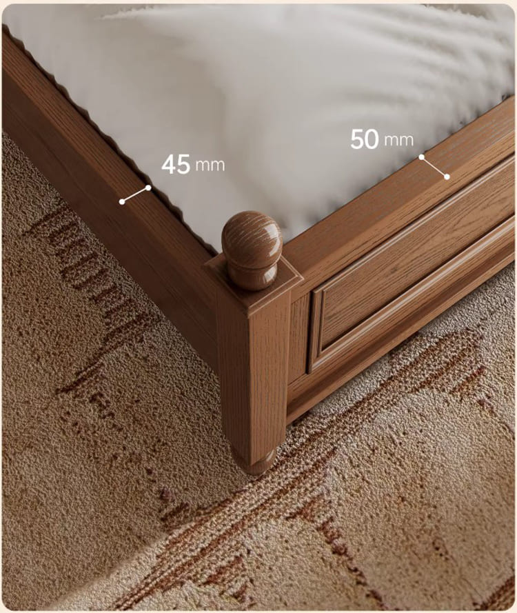 Kết cấu chắc chắn từ giường ngủ gỗ sồi giúp hạn chế tiếng kêu, rung lắc khi sử dụng, hỗ trợ giấc ngủ trọn vẹn.
