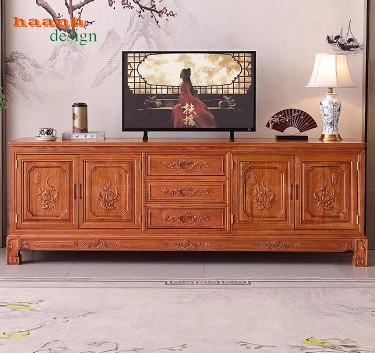Phong cách cổ điển Trung Hoa nổi bật với những đường nét mềm mại, cân đối và giàu tính nghệ thuật. Các mẫu kệ tivi gỗ đẹp theo phong cách này thường mang vẻ đẹp sang trọng, quyền quý và không bị lỗi thời theo thời gian.
