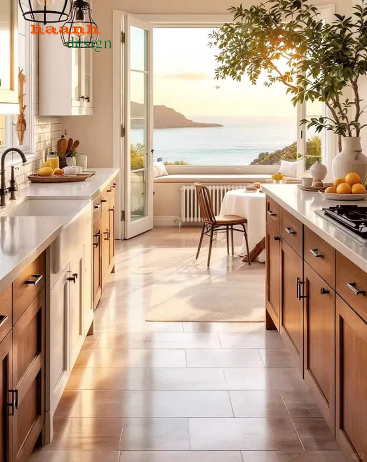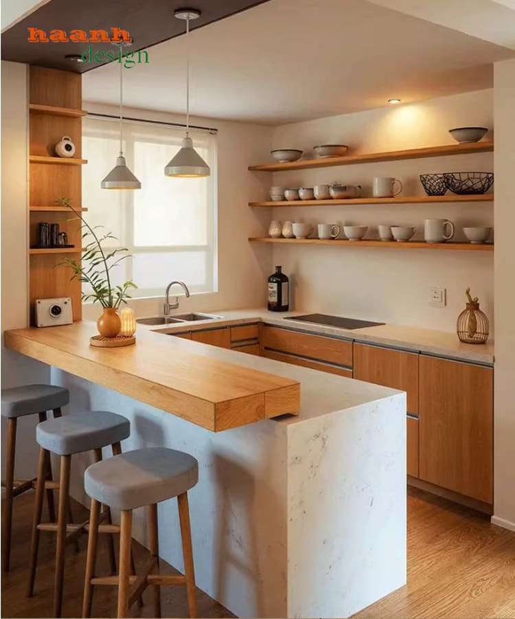 Mẫu **tủ bếp công nghiệp** kết hợp gỗ sồi tự nhiên