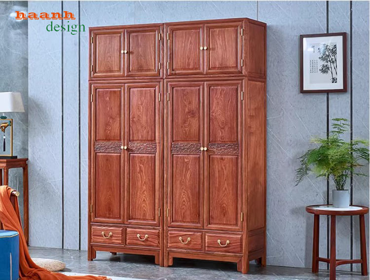 Tủ gỗ đựng quần áo từ gỗ gõ đỏ Nam Phi, sơn PU Inchem Mỹ và phụ kiện Blum Áo mang đến giải pháp lưu trữ bền đẹp, sang trọng cho phòng ngủ gia đình. Với thiết kế phong cách Trung Quốc giả cổ, sản phẩm không chỉ tối ưu công năng mà còn nâng tầm giá trị thẩm mỹ cho không gian sống.