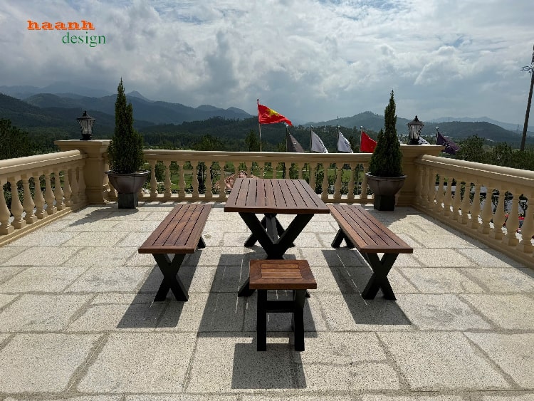 Mặt bàn sử dụng gỗ Teak tự nhiên nhập khẩu – một trong những loại gỗ quý có độ bền cao, khả năng chống mối mọt và cong vênh tuyệt vời. Bề mặt được sơn phủ 5 lớp vật liệu Inchem ngoài trời kháng UV nhập khẩu từ Mỹ, giúp giữ nguyên vân gỗ tự nhiên độc đáo, mang lại cảm giác sang trọng và gần gũi.