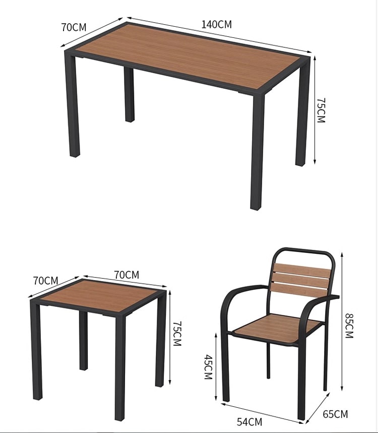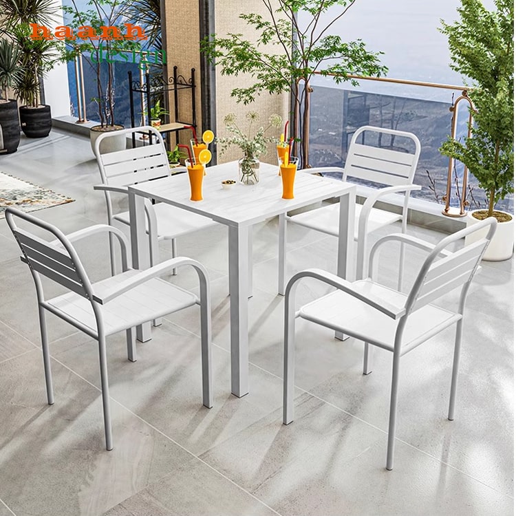 Mặt gỗ nhựa: Mặt bàn và ghế thường được làm từ gỗ nhựa composite hoặc nhựa tái chế, chúng có khả năng chống nước, không mục nát, và không cần bảo trì nhiều như gỗ tự nhiên. Gỗ nhựa có nhiều vân nhiều màu sắc cho khách hàng lựa chọn tùy theo không gian phù hợp