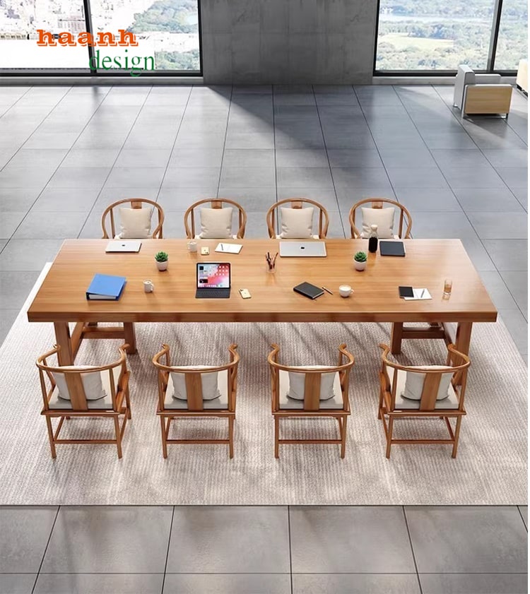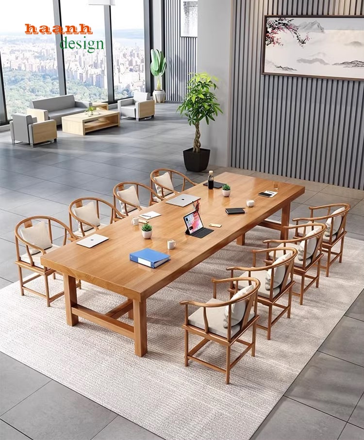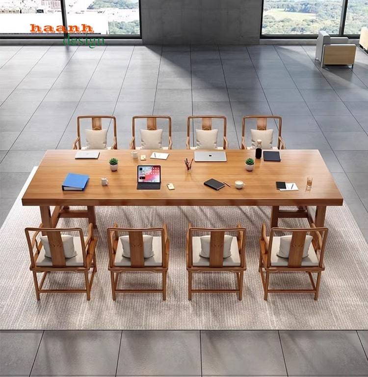 - Bàn ghế đơn giản: Phong cách Á Đông cũng có những kiểu dáng bàn ghế phòng họp đơn giản và tối giản. Những bộ bàn ghế này thường có đường nét thanh thoát, không có nhiều chi tiết hoặc chạm khắc phức tạp. Gỗ tự nhiên được tôn vinh và tạo điểm nhấn cho không gian phòng họp.