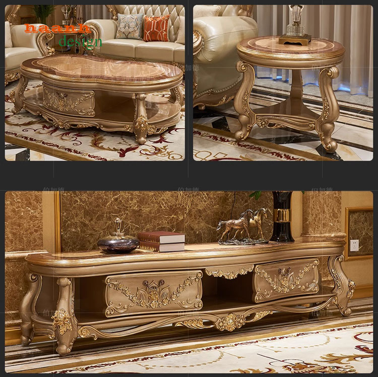 Bàn ghế phòng khách tân cổ điển Châu Âu cao cấp thường mang trong mình một phong cách lịch lãm, tinh tế và đậm chất cổ điển Châu Âu. Những sản phẩm như này thường được làm từ các chất liệu chất lượng cao như gỗ tự nhiên, da thật, và các loại vải sang trọng. Dưới đây là một số đặc điểm thường thấy trong thiết kế của bàn ghế phòng khách tân cổ điển Châu Âu cao cấp: