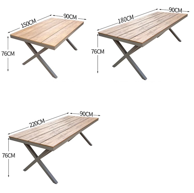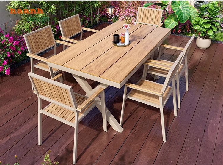 Gỗ Teak: Gỗ Teak (còn được gọi là gỗ Tali) là một loại gỗ quý có tính năng chống thấm nước và chống mối mọt tự nhiên. Gỗ Teak cũng có màu nâu ấm và vẻ đẹp tự nhiên, làm tôn lên sự sang trọng cho sản phẩm. Tuy nhiên, gỗ Teak cần được bảo quản thường xuyên để duy trì vẻ đẹp ban đầu và ngăn chặn sự biến đổi màu sắc do tác động của thời tiết.