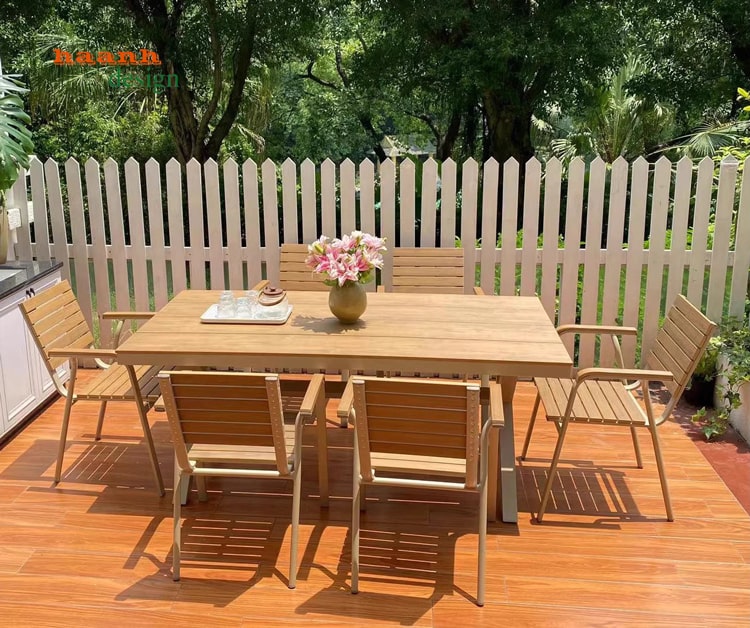 Mặt bàn và ghế gỗ Teak: Gỗ Teak là một loại gỗ quý hiếm với khả năng chống mục nát và chịu nước tốt. Teak thường được sử dụng trong nội thất và ngoại thất do tính năng này. Gỗ Teak có màu sắc đẹp và tự nhiên, khi vẫn bảo quản màu và độ bóng ban đầu sau một thời gian.