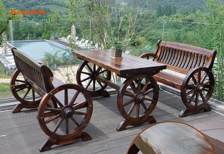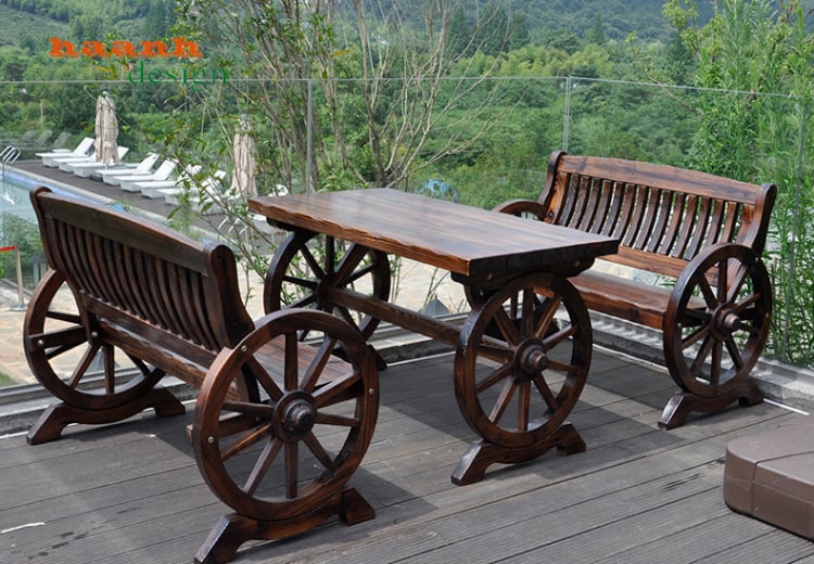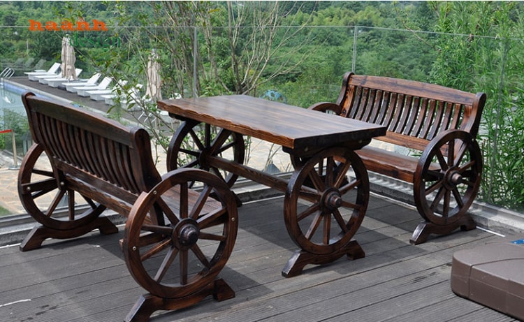 Bàn ghế sân vườn cổ điển mẫu bánh xe do công ty chúng tôi thiết kế và sản xuất bằng chất liệu gỗ Teak tự nhiên, nhập khẩu từ Nam mỹ, nguyên liệu gỗ Teak là loại gỗ chịu nắng mưa thời tiết ngoài trời rất tốt. Gỗ không bị ăn mòn, không mục nát và bị mốc bám như các loại gỗ khác.
