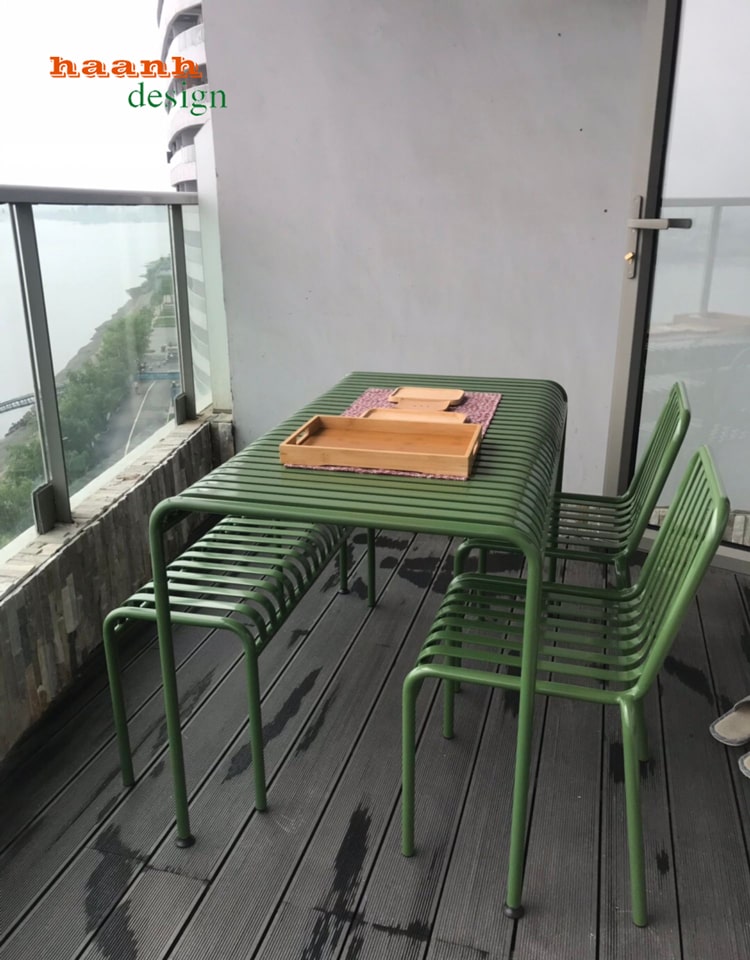 Bàn ghế BGS001 được thiết kế toàn bộ đều bằng sắt. Và điểm thu hút nhất của bàn ghế sắt là những thanh sắt nằm song song với nhau. Với thiết kế nhìn có vẻ thanh mảnh nhưng lại đảm bảo an toàn. Mặt bàn có hình chữ nhật làm tăng diện tích thoải mái với 4 chân trụ chắc chắn.