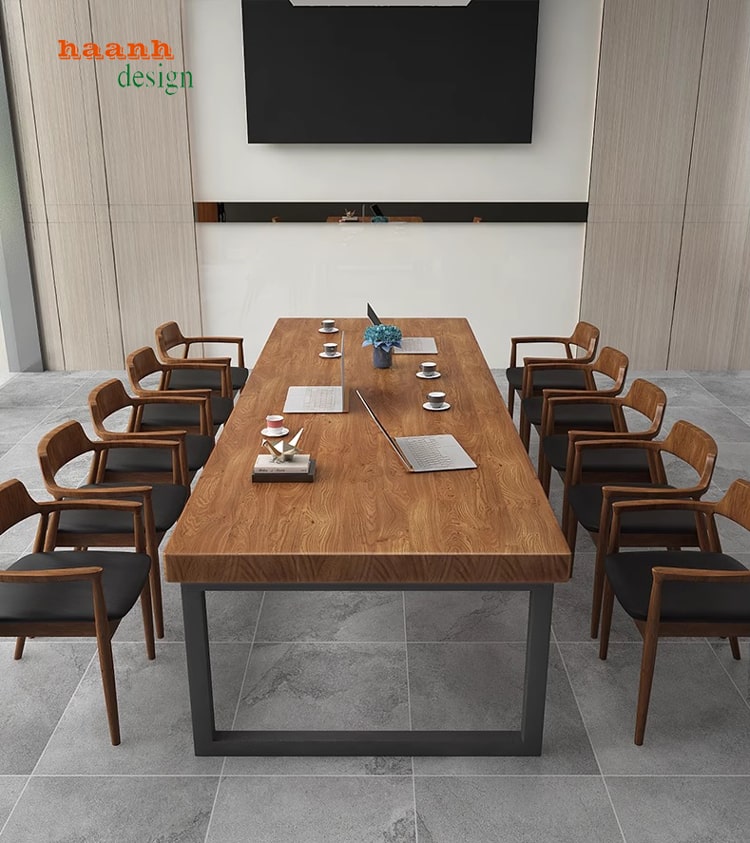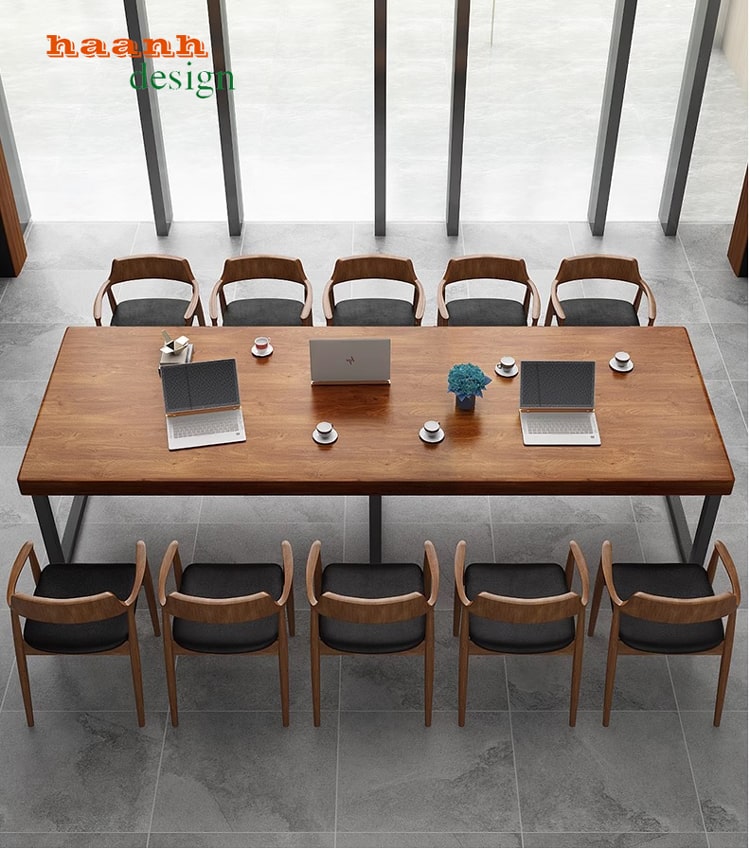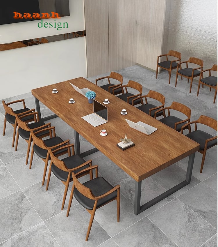 Kích thước: Kích thước của bàn họp mặt gỗ chân sắt có thể đa dạng, tùy thuộc vào nhu cầu của bạn và kích thước không gian. Bàn có thể là hình chữ nhật, hình tròn, hình oval, hoặc hình vuông.