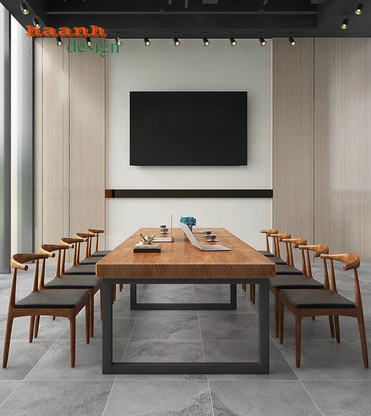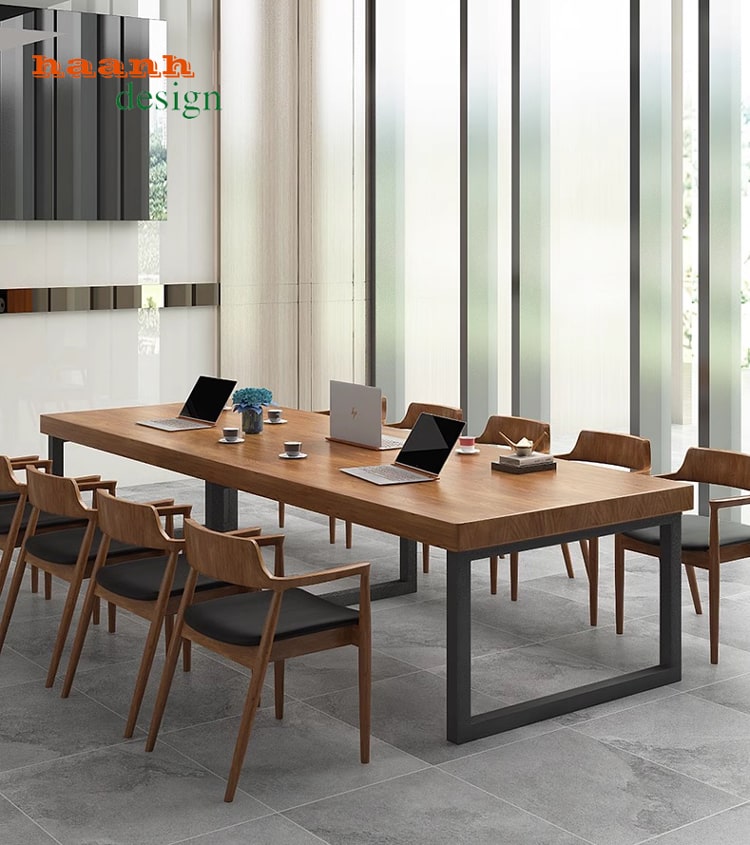 Bàn họp mặt gỗ chân sắt thường được sử dụng trong không gian văn phòng để tổ chức các cuộc họp, hội thảo hoặc làm việc nhóm. Đây là một lựa chọn phổ biến bởi sự kết hợp giữa vẻ đẹp tự nhiên của gỗ và tính chắc chắn của chân sắt, tạo nên sự hiện đại và chuyên nghiệp cho môi trường làm việc. Dưới đây là một số đặc điểm thường thấy của bàn họp mặt gỗ chân sắt văn phòng: