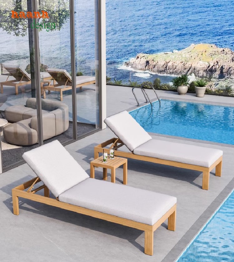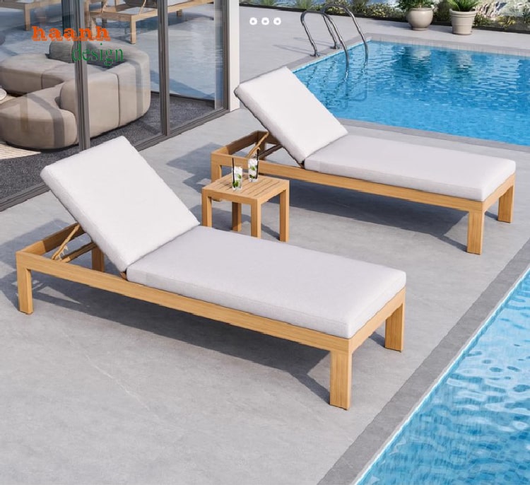 tổng quan giường tắm nắng gỗ Teak tự nhiên sang trọng đặt cạnh hồ bơi