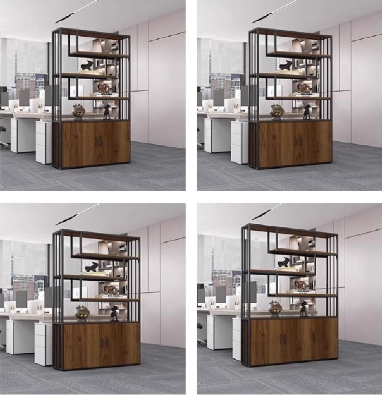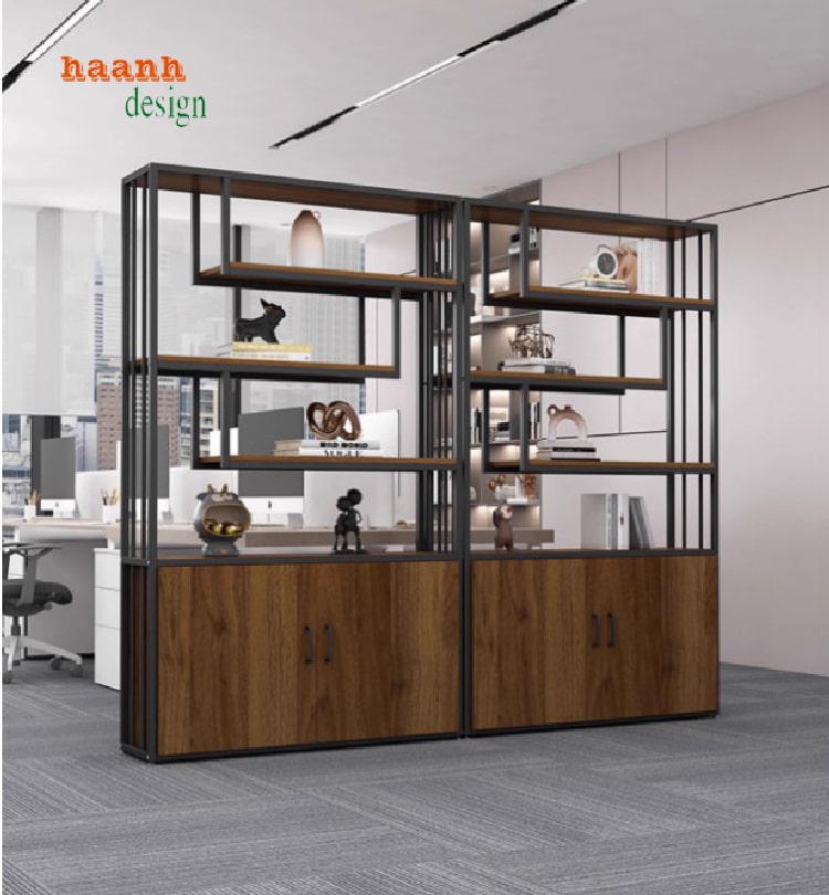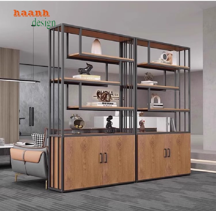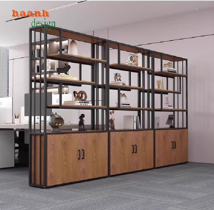Trong môi trường làm việc, kệ sắt gỗ bày đồ trang trí còn giúp tổ chức tài liệu gọn gàng, nâng cao hiệu suất làm việc. Mỗi tầng kệ có thể chịu được tải trọng lớn, dễ dàng để các loại sách, tài liệu, máy in mini, hoặc thùng hồ sơ.