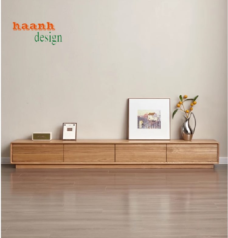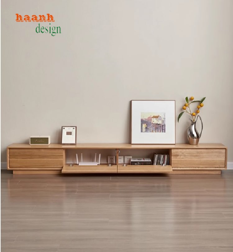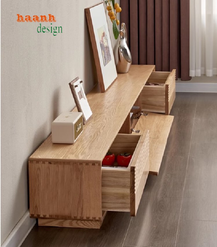 Toàn cảnh kệ tivi làm bằng gỗ sồi Nga tự nhiên sang trọng.