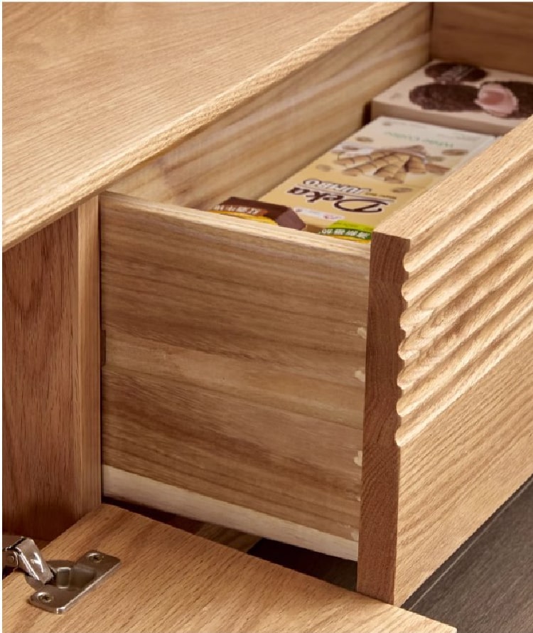 Các ngăn kéo và bản lề đều sử dụng phụ kiện giảm chấn Hafele nhập khẩu từ Đức, đảm bảo độ êm ái khi đóng mở và tăng tuổi thọ cho sản phẩm. Sự kết hợp giữa chất liệu tự nhiên và công nghệ hiện đại mang đến trải nghiệm sử dụng tuyệt vời.