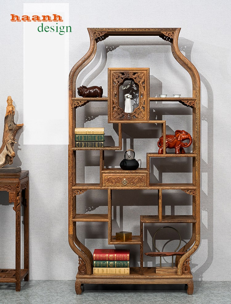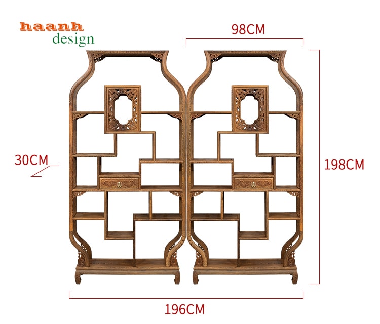 Kệ trang trí giả cổ gỗ tự nhiên tại nội thất Hà Anh được bao gồm 2 kệ đứng giống nhau có thể ghép vào hoặc tách ra tùy theo nhu cầu của khách hàng. Đặc biệt, thiết kế ở nội thất Hà Anh theo hướng giả cổ, mang đậm phong cách văn hóa Á Đông. Kệ trang trí được chạm trổ tạo thành các đường nét văn văn nghệ thuật mang hơi hướng cổ xưa.