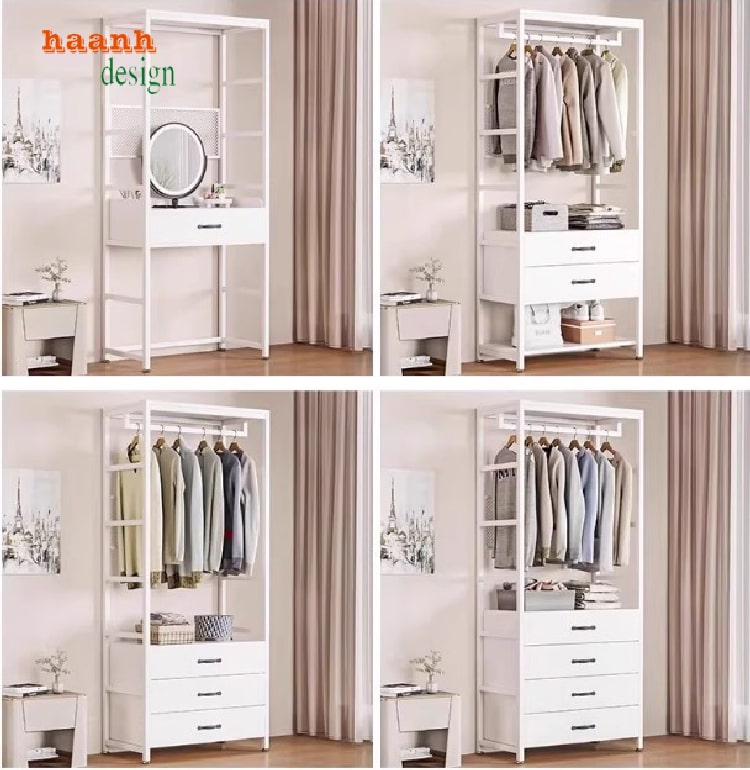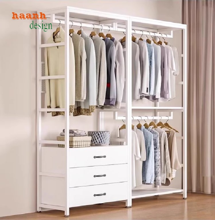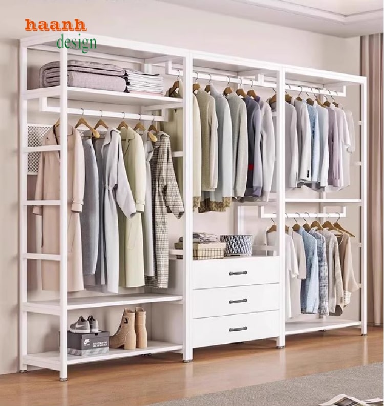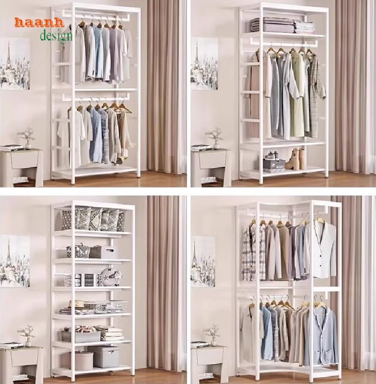 Kệ treo quần áo bằng sắt thường được thiết kế theo phong cách tối giản – hiện đại, phù hợp với đa dạng không gian từ nhỏ đến lớn. Các mẫu thiết kế có thể: