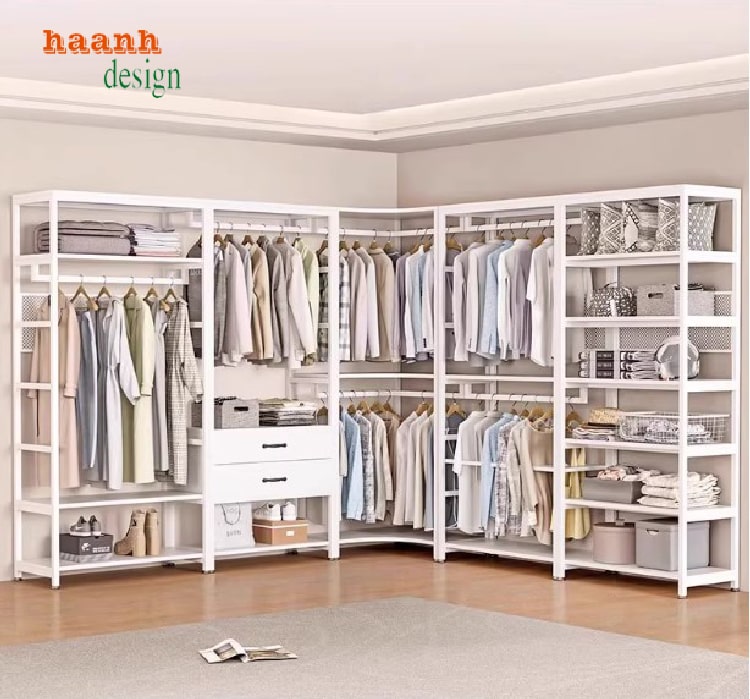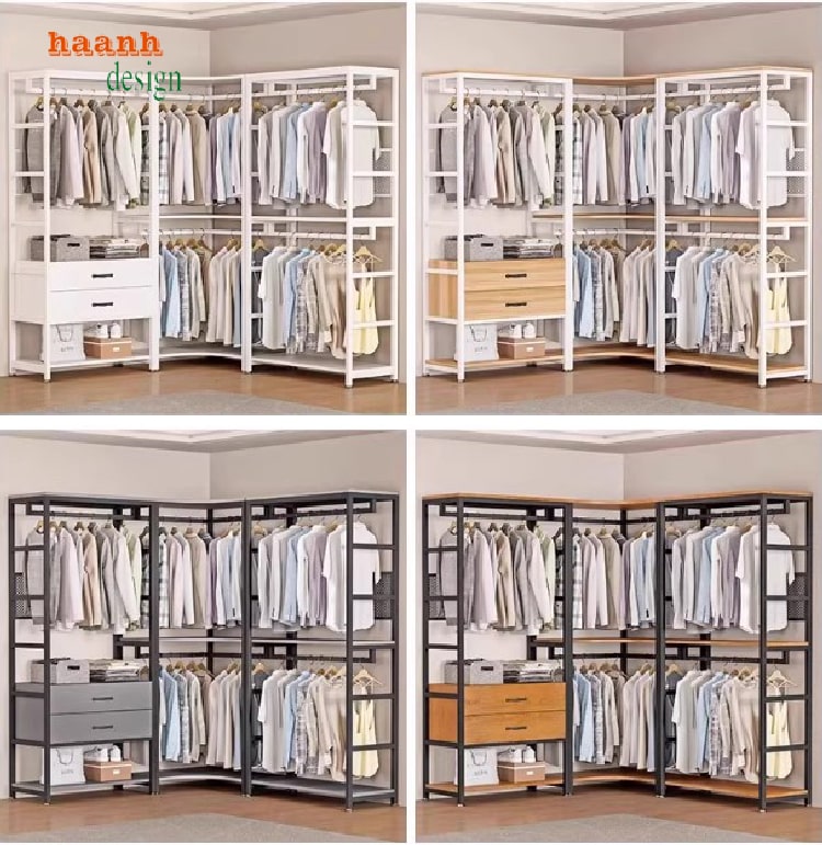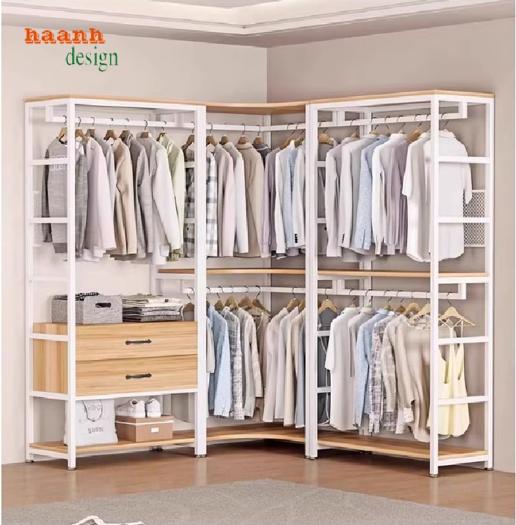 Tại các phòng ngủ nhỏ, đặc biệt trong các căn hộ hiện đại, kệ sắt treo quần áo kết hợp kệ gỗ là giải pháp thay thế tủ quần áo truyền thống. Kệ vừa giúp không gian thoáng đãng, vừa tạo sự tiện lợi khi sử dụng hàng ngày.