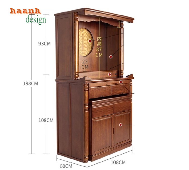 Thiết kế dạng tủ đứng, có nhiều ngăn, tầng cao ráo phù hợp đặt tượng Phật, hoa quả, đèn nhang... Phù hợp với không gian phòng thờ riêng.