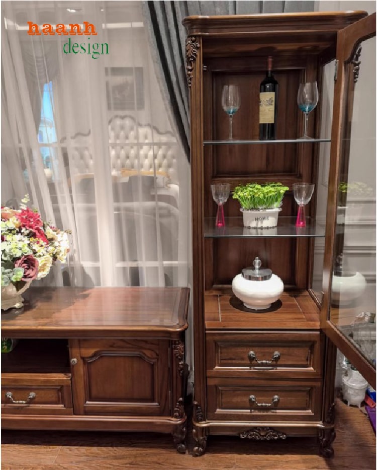 Người dùng có thể tận dụng khoảng trống bên dưới tivi để trưng bày những chai rượu quý, ly uống rượu hoặc các bộ đồ dùng liên quan. Điều này không chỉ làm cho không gian trở nên sang trọng mà còn thể hiện gu thẩm mỹ của chủ nhà.