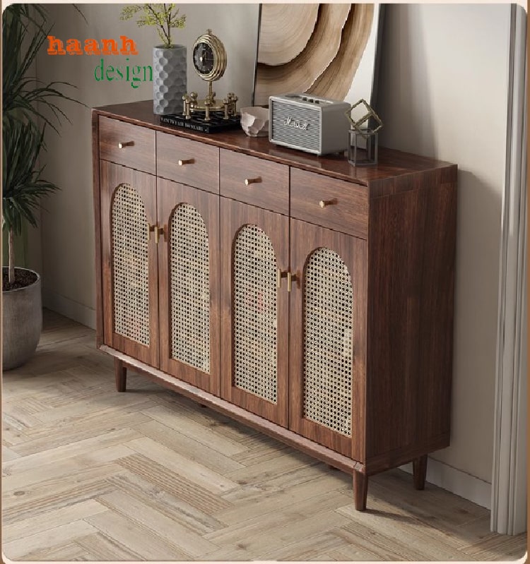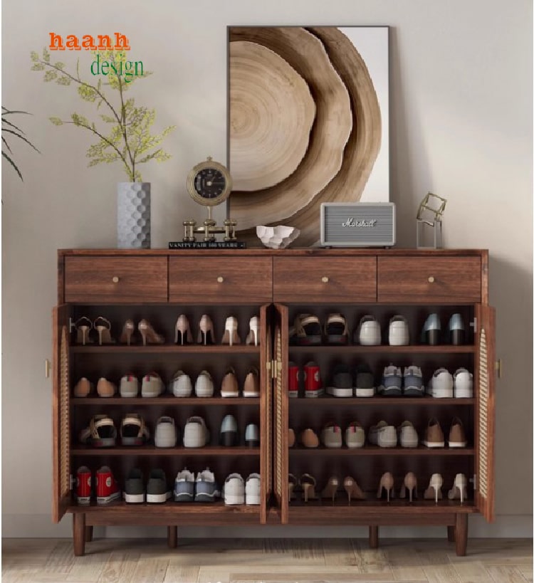 Việc sở hữu một chiếc tủ giày gỗ óc chó cánh mây sẽ giúp bạn tổ chức không gian sống một cách hiệu quả hơn. Không chỉ lưu trữ giày dép, tủ còn có thể tận dụng để chứa các vật dụng khác như áo khoác, phụ kiện đi kèm.
