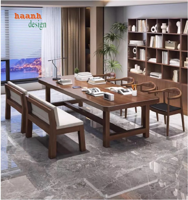 Bàn họp văn phòng bằng gỗ thường được biết đến với chất lượng vượt trội và thiết kế tinh tế. Chúng thường được làm từ các loại gỗ tự nhiên như gỗ sồi, gỗ óc chó hoặc gỗ teak. Những loại gỗ này không chỉ có độ bền cao mà còn mang lại vẻ đẹp tự nhiên với nhiều màu sắc và vân gỗ đa dạng.