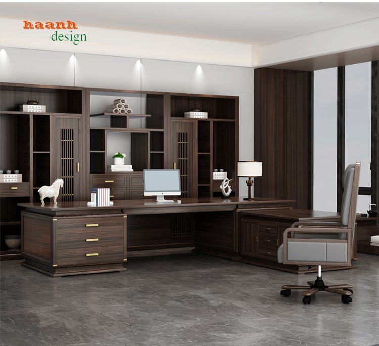- Bàn làm việc: Chọn bàn làm việc có kích thước rộng rãi và chất liệu gỗ sang trọng. Bàn có thể có các chi tiết tinh tế như hộp đựng, ngăn kéo và bề mặt phẳng để làm việc thuận tiện. Đồng thời, hãy đảm bảo rằng bàn có đủ không gian để đặt các thiết bị công nghệ như máy tính, màn hình và bàn phím.