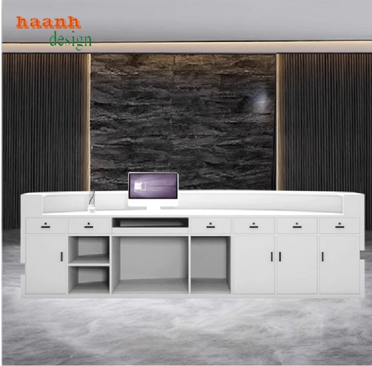 Với thiết kế khoa học, tối ưu công năng, quầy tiếp tân công ty giúp nhân viên thao tác thuận tiện, dễ dàng lưu trữ và quản lý tài liệu, thiết bị.