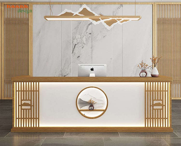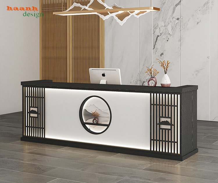 Sản phẩm được thiết kế với kiểu dáng hình chữ U truyền thống, tuy cổ điển nhưng vẫn rất sang trọng. Điểm nhấn của cả quầy lễ tân văn phòng là mặt trước có thiết kế họa tiết tròn, bao quanh là viền gỗ, như một bức tranh thủy họa mang lại cảm giác yên bình và quyến rũ.