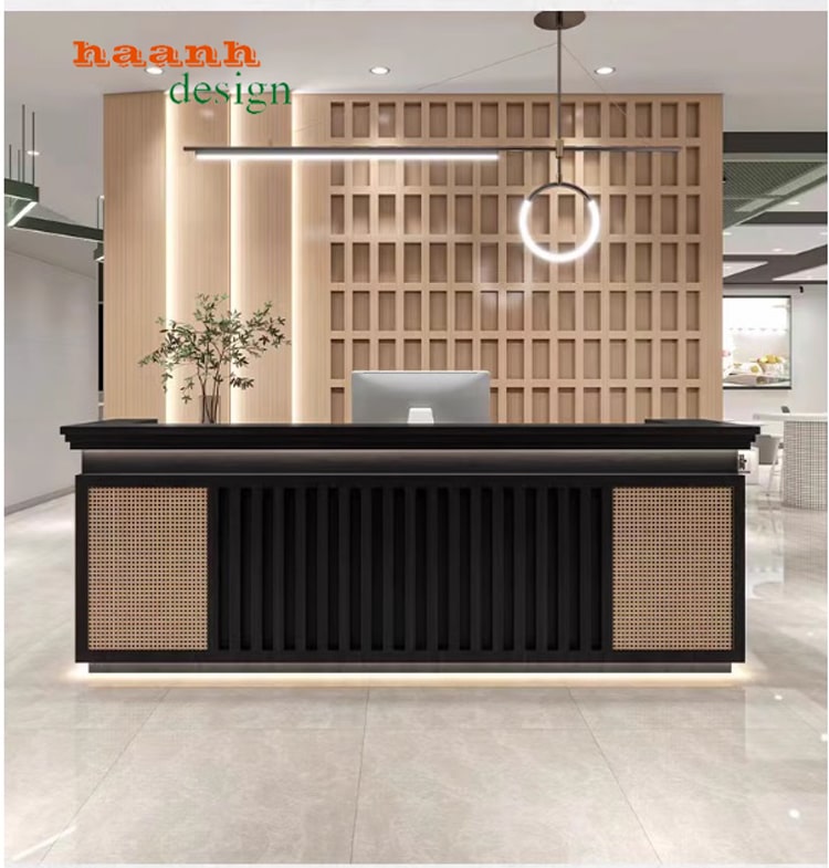 Thiết kế quầy lễ tân hiện đại thường mang đậm phong cách tối giản và hiện đại. Điểm nhấn của quầy thường là những đường nét đơn giản và tinh tế, tạo cảm giác sang trọng và chuyên nghiệp cho không gian lễ tân.