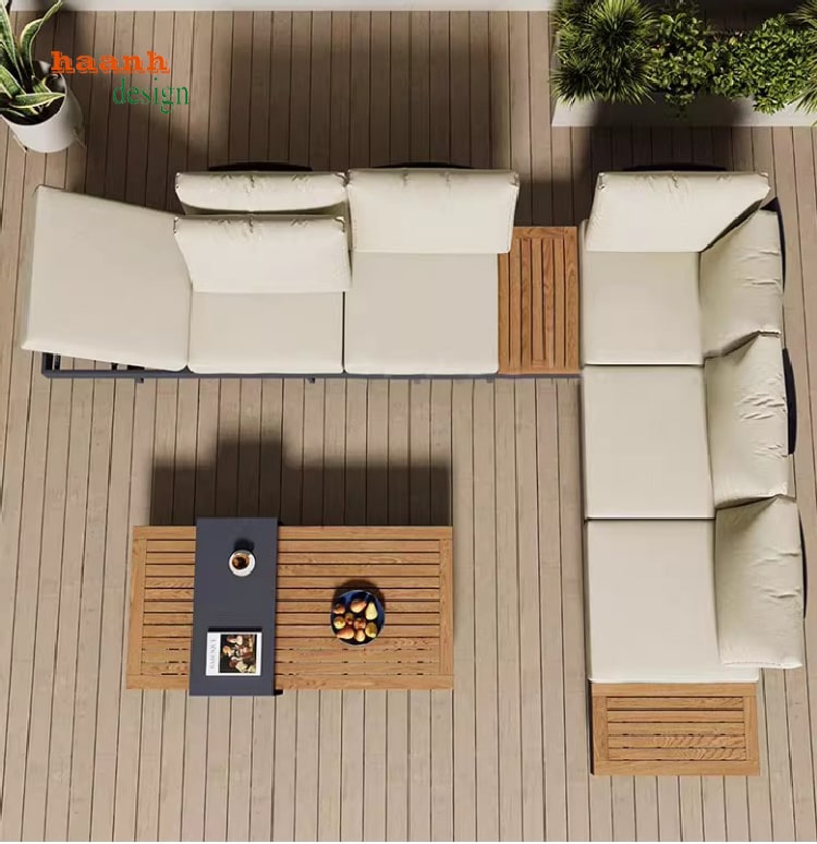 Sản phẩm được chế tác từ chân sắt hộp sơn tĩnh điện, mặt gỗ Teak tự nhiên và đệm vải kháng nước ngoài trời, kết hợp cùng quy trình sản xuất công nghệ cao. Nhờ đó, bộ bàn ghế sofa ngoài trời không chỉ chắc chắn mà còn giữ được vẻ đẹp sang trọng theo thời gian.