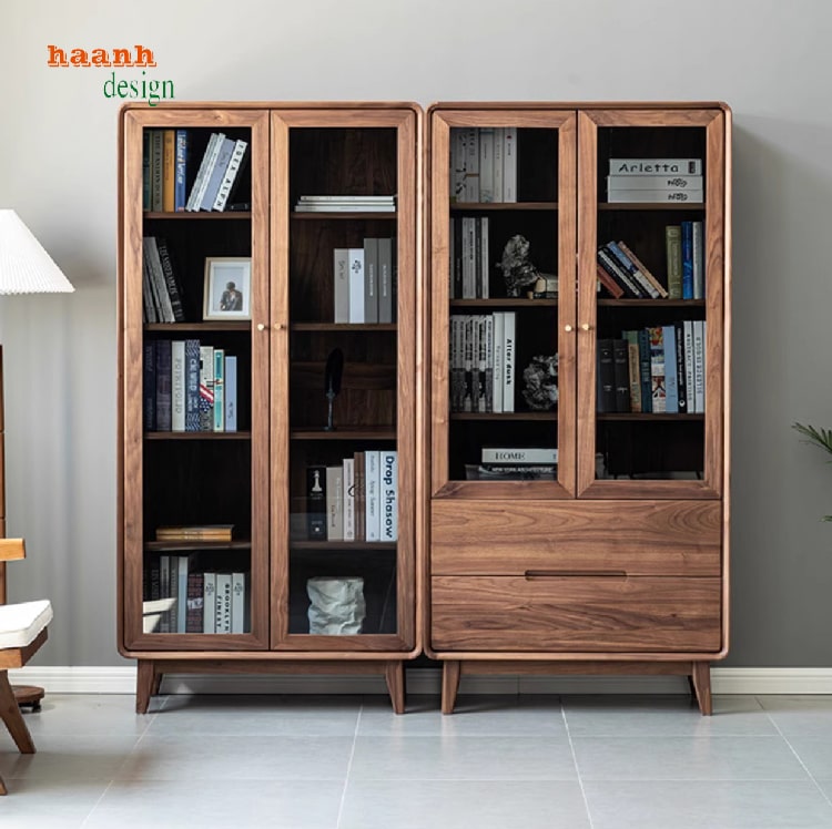 Sự kết hợp giữa gỗ óc chó và kính cường lực cũng là một xu hướng thú vị. Kính trong suốt giúp không gian trở nên rộng rãi và thông thoáng hơn, đồng thời giúp bạn dễ dàng tìm kiếm sách mà không cần mở cửa tủ.