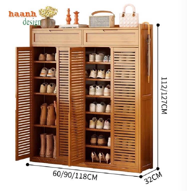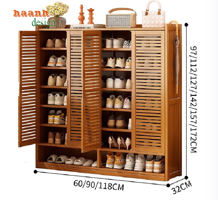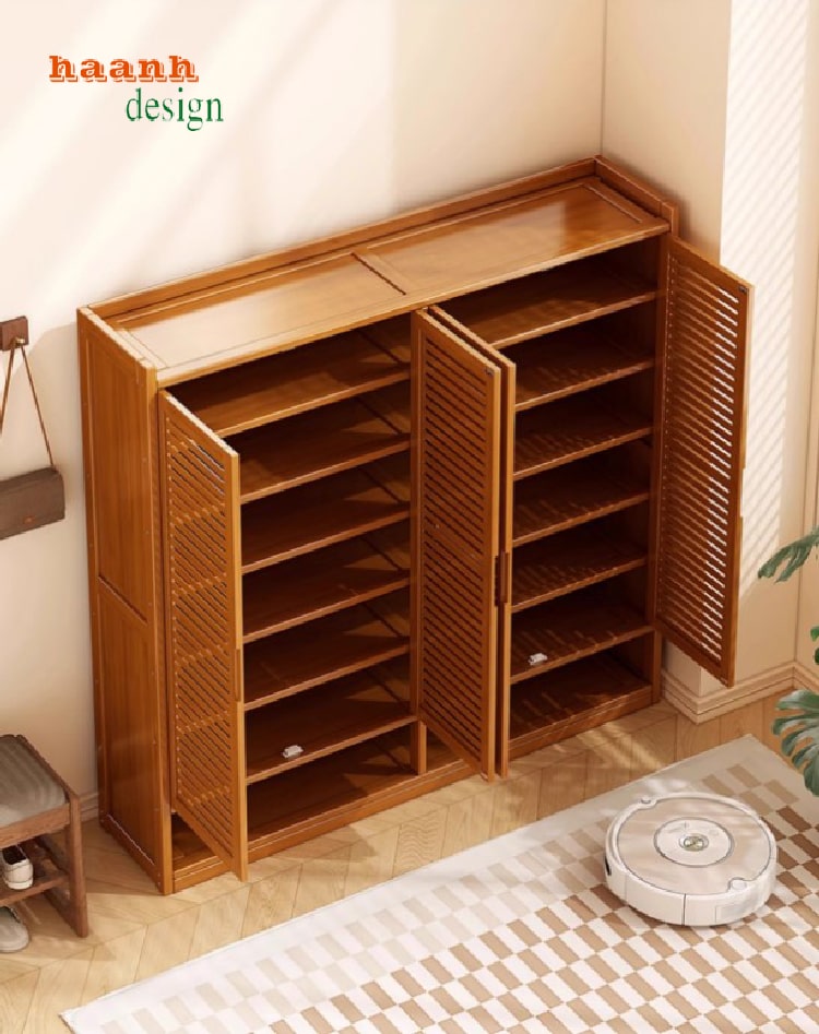 Một điểm nhấn độc đáo trong thiết kế của tủ đựng giày dép gỗ tự nhiên là phần cánh cửa làm bằng nan chớp. Không chỉ tạo nên vẻ đẹp ấn tượng, thiết kế này còn giúp thoát khí và hạn chế mùi hôi giày hiệu quả, đảm bảo sự thông thoáng cho toàn bộ khoang tủ.