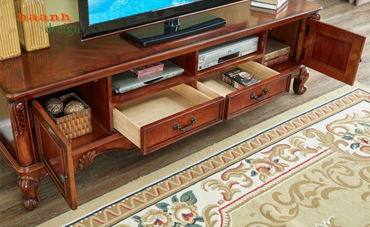 - Chức năng: Tủ trang trí phòng khách tân cổ điển châu Âu thường có nhiều ngăn kéo và kệ để trưng bày các vật phẩm trang trí như đồ thủ công mỹ nghệ, ấn phẩm sách, hoặc các bức tranh. Ngoài ra, chúng cũng có thể được sử dụng để lưu trữ đồ dùng gia đình như đĩa DVD, sách báo, hay vật dụng khác.