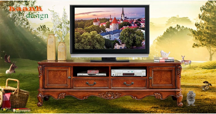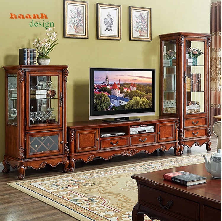 - Chất liệu: Tủ trang trí phòng khách tân cổ điển châu Âu thường được làm từ gỗ tự nhiên cao cấp như gỗ dáng nguyên tử, gỗ tuyết tùng, gỗ sồi hoặc gỗ hồng đào. Đôi khi, chúng cũng có thể được phủ lớp sơn mài hoặc sơn mờ để tăng thêm vẻ bóng và sự sang trọng.