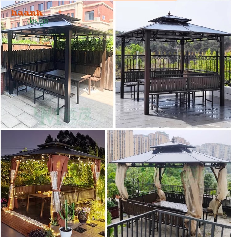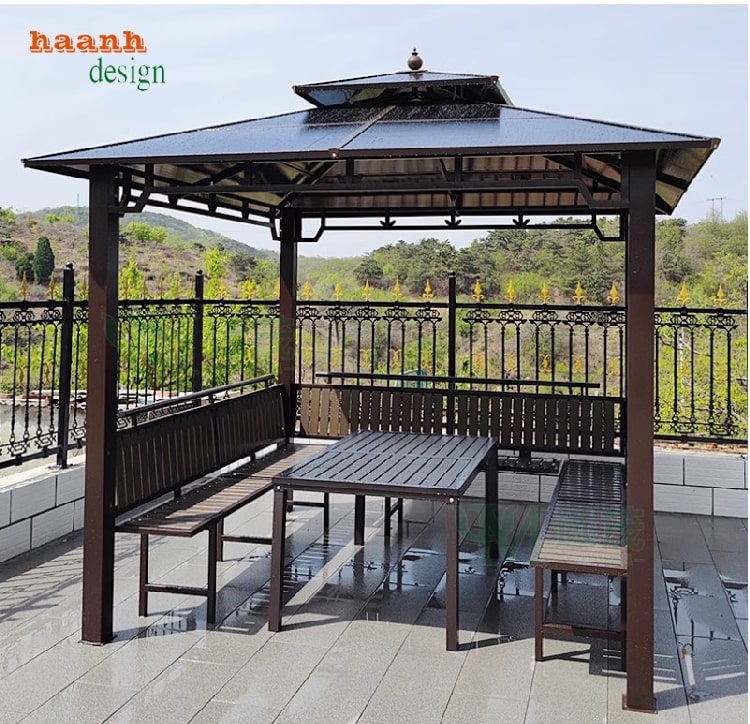 Chòi nghỉ sân vườn bằng sắt được thiết kế với chất liệu chắc chắn, có khả năng chống chịu tốt với thời tiết, do đó độ bền của chúng rất cao.